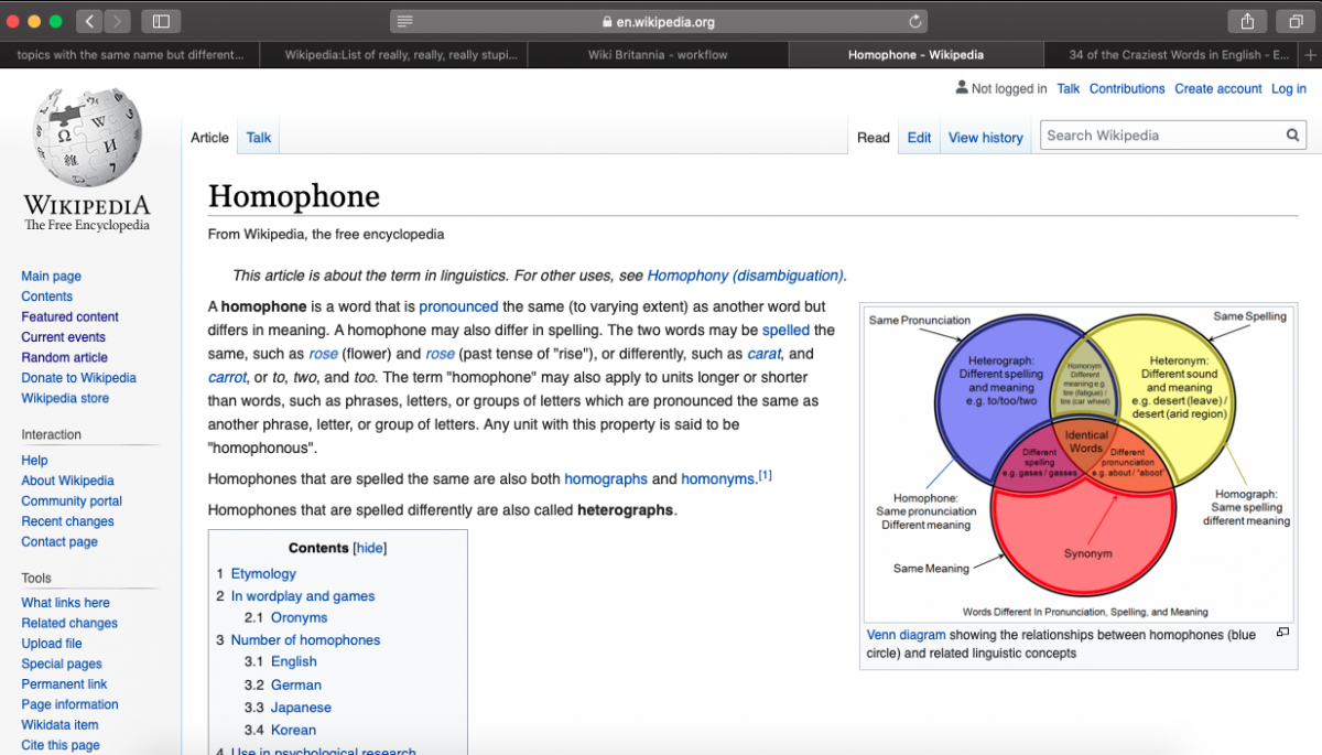 After coming up with the idea for a homophone style document, I thought a wider range of people were needed to think of words that would work. I could then simply find the wiki article concerning this subject and chose the two different articles related.