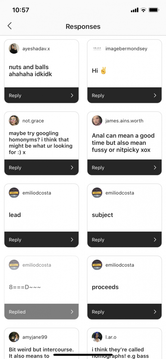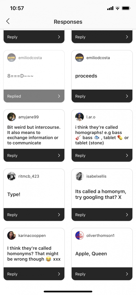 Due to the quarantine, whilst asking my household, I also took to different social media groups to ask the question. I used Instagram to yield a younger audience and used my mothers Facebook account for a more mature audience. The best answers came from Instagram, perhaps because they understood the need for a word with rich depth rather than simply words that are the same.
