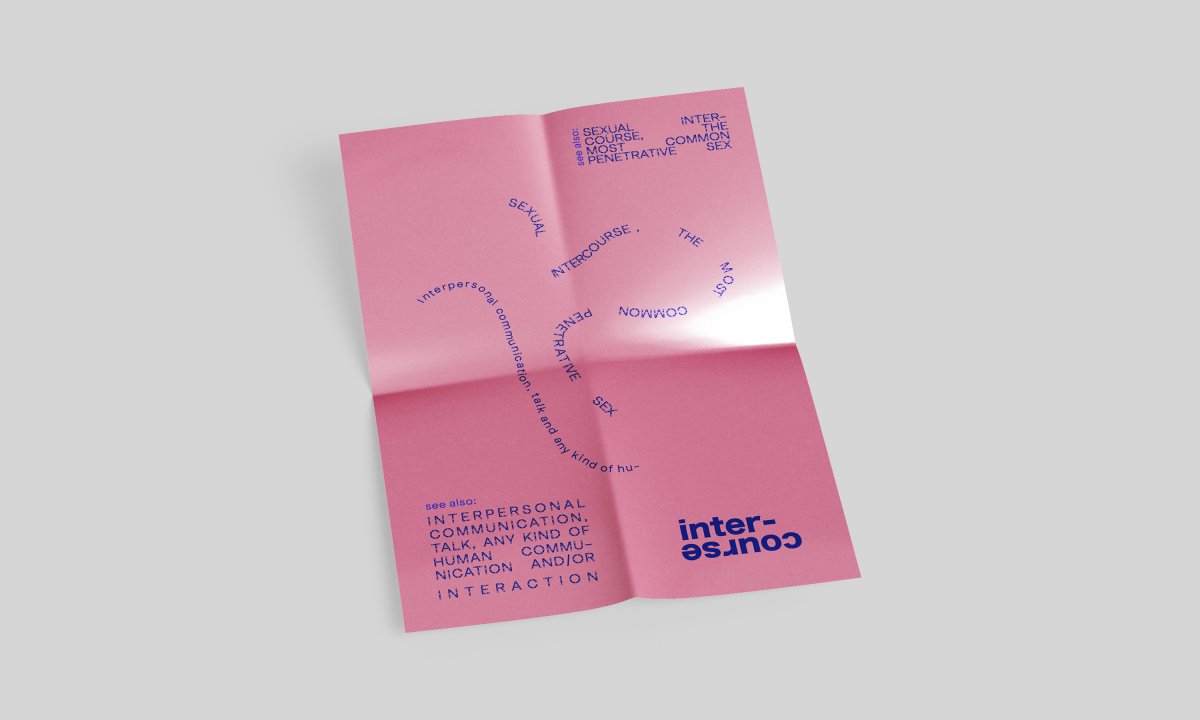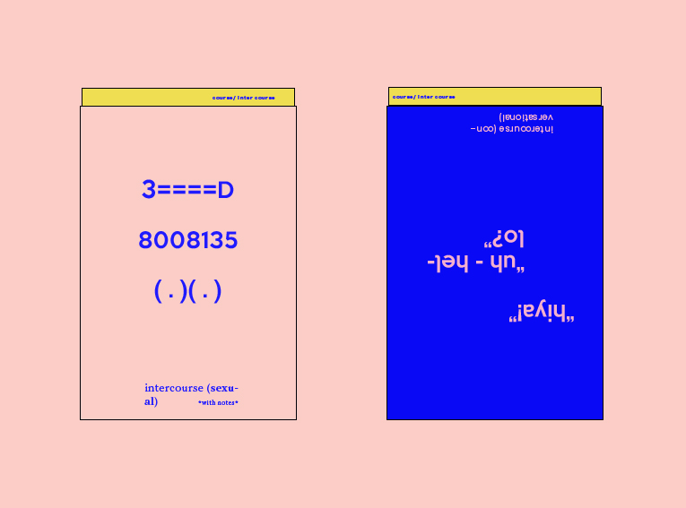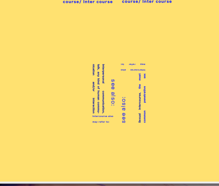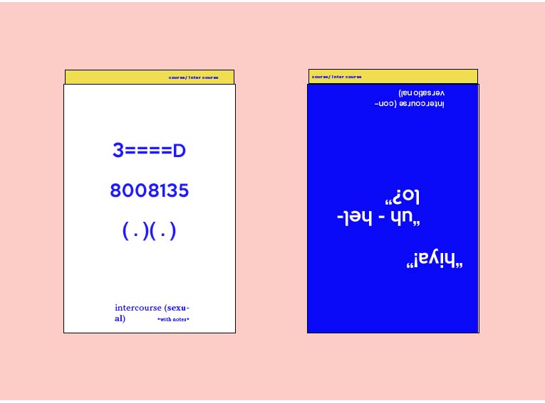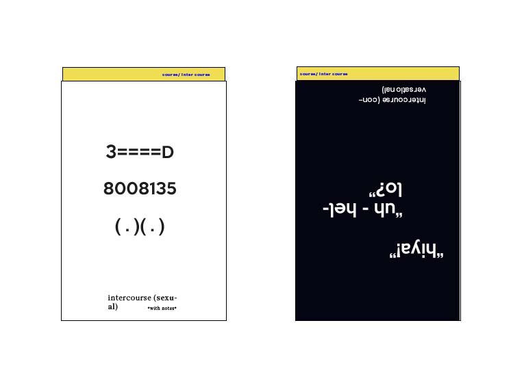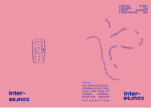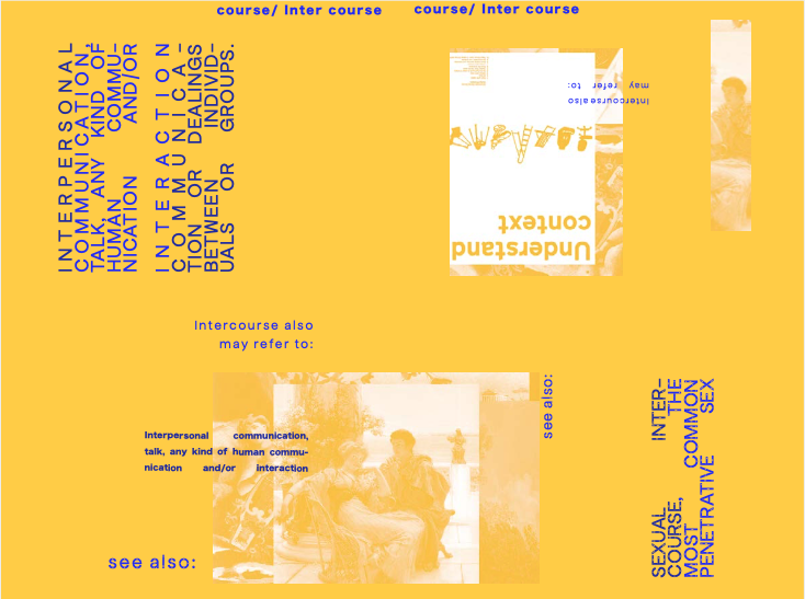 The book is split into two sections. The first being intercourse (sexual) and the back half being intercourse (conversation). In the middle of the book, there is a loose sheet of a3/a2 depending on the size of the page. It folds out and includes both definitions of intercourse and the homophone. Images and words and shown side by side.