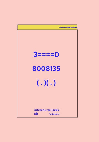 Therefore, I moved away from the original idea, and chose a pink colour with blue writing. It's not perfect, but with limited facilities I think it works in a sort of low fi way. The phone symbolises both types of intercourse. The text is the two separate definitions. I like how the word 'intercourse' is half flipped, making it equal to read from both sides of the document.