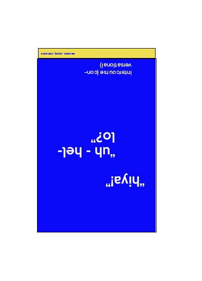 The mockup helps to illustrate the type of design I am going for, how it would look had I been able to print. It shows how the book is flipped for the different halves and how there's is no back cover, simply two fronts. I think the neat grid works well to keep the text in order and the non-linear shapes help to contrast this. The balance of the text and negative space is one of the strong points. Yet it maybe is not enough, it doesn't relate to the term 'intercourse' all that well, the design could've used more substance perhaps. The initial idea of basing the design on school notes was interesting but due to certain limitations, I haven't been able to fulfil this.