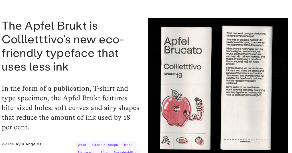 A love at first sight story occurred when I saw Apfel Brukt, on the Collettivos type foundary. The font felt like it had a real human touch. The idea of using less ink through simple small dots is revolutionary, although it doesn't relate much to conversation in a tradition sense. I think this typeface represents a very human state of mind. It's a conscious font, designed to be more ego friendly whilst still appearing as a stylish, modern font. Finding a font to represent social intercourse is perculiar and rather than an obvious link, I like this subtle nod through the social aspects of the typeface.
