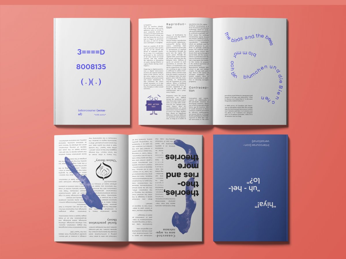 Shape plays a role throughout this document, I think this feature page works well to link the imagery and main body text. It uses the phrase 'the birds and the bees' and then 'blommor och bin' and 'blumchen und die Bienchen', these are from Sweden and Germany meaning 'the flowers and the bees'. The phrase 'the bird and the bees' originates from as bees pollinate flowers thus the life cycle continues, a reference to sex that's 'child friendly'. In the English language we use this as a euphemism for sex, therefore it seems fitting to put within the sexual intercourse section. Although, the text is informative, I don't think it needs to be explicit. The phrase 'the birds and the bees' is always a nice way to introduce younger audiences to the subject and will be a gentle reminder of past conversations to the current audience.